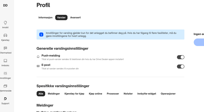 For å redigere varsler må du inn på profilen din øverst i høyre hjørne inne i Drive Dealer.